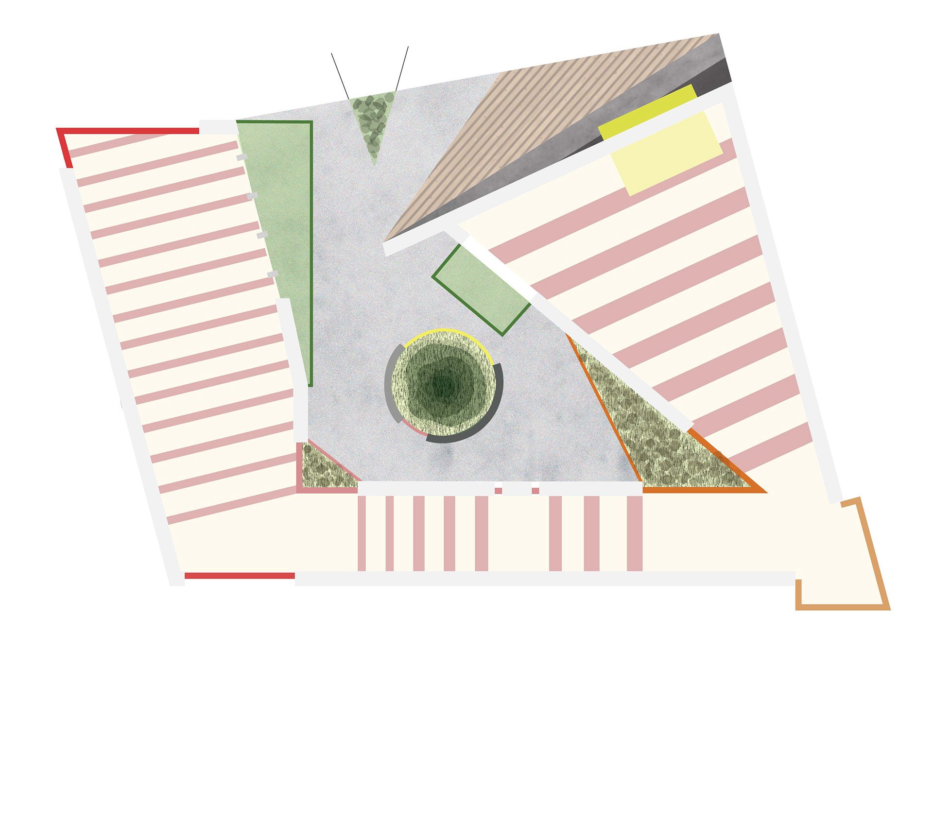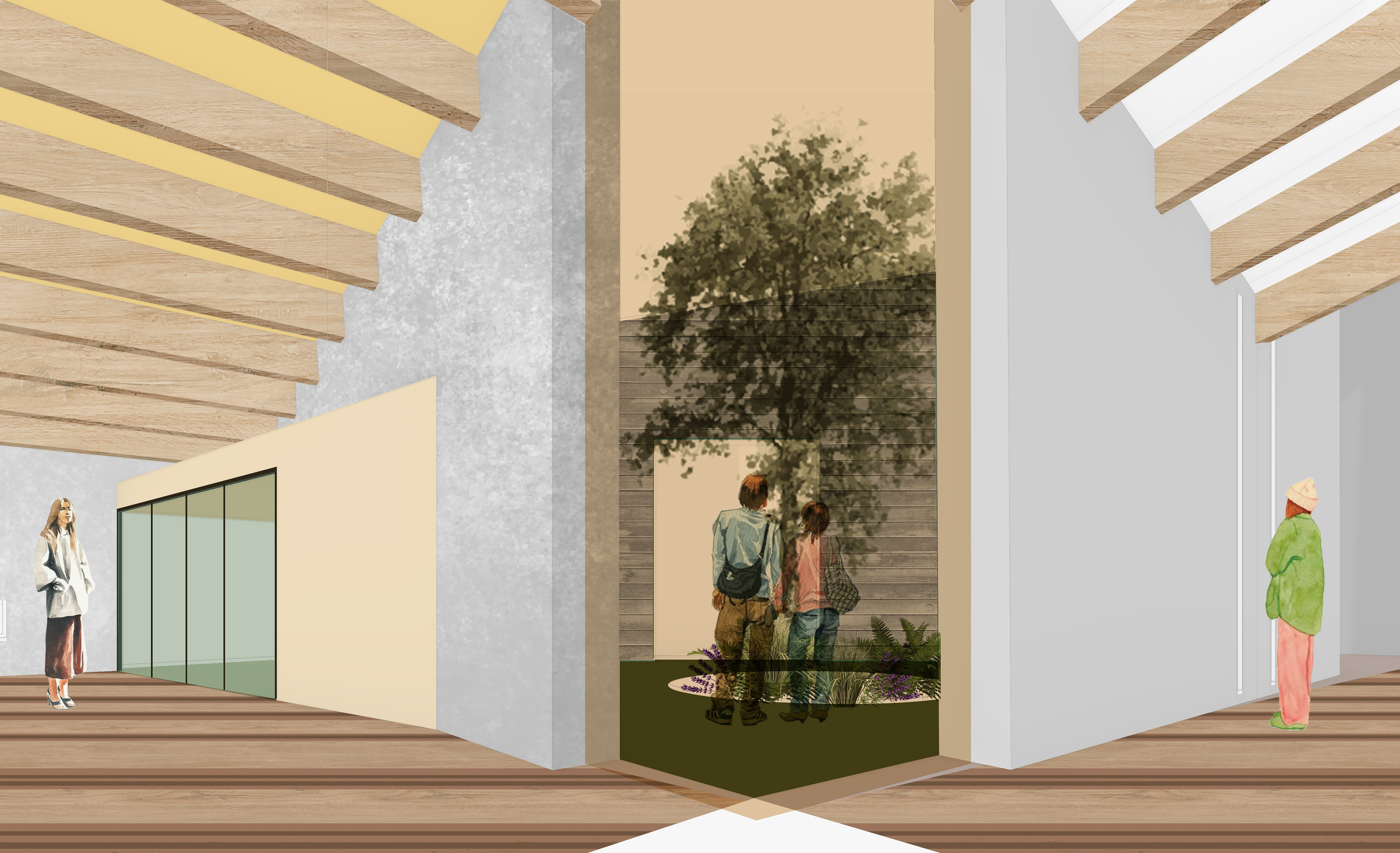 The pavilion’s design is guided by the concept of cones of view, shaping the way visitors experience the space. As one moves through the pavilion, variations in ceiling height and roof tilt are intended to evoke different emotional responses. Repetitive wooden beams span the interior, with spacing that adapts to the scale and function of each exhibition area. Colored, tinted glass is strategically incorporated to further influence mood and perception.