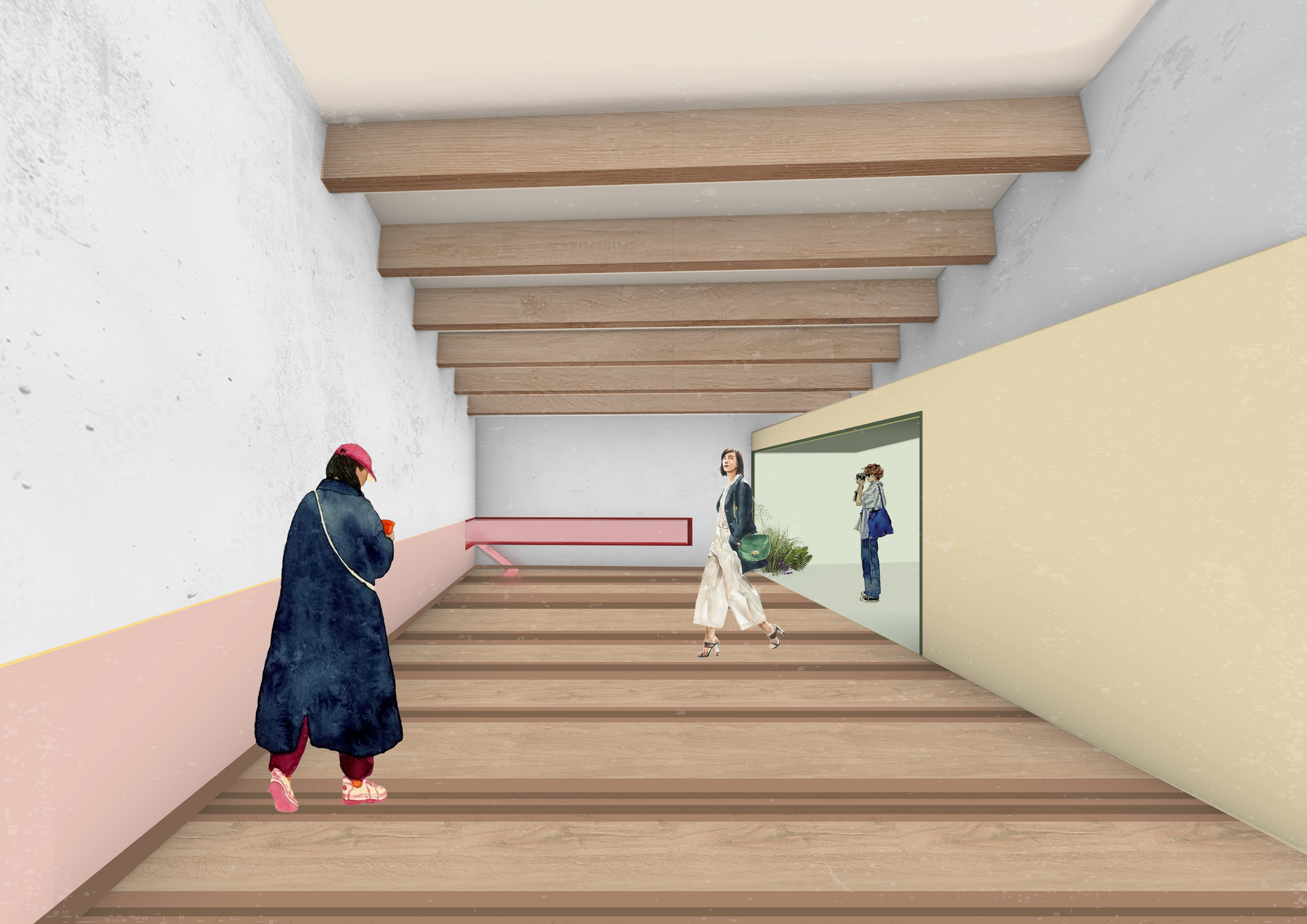 The visual language of the pavilion reflects a balance between clarity and curiosity. The images reveal how light, color, and geometry interact to guide movement and emotion. The interplay of solid and void is carefully composed to frame specific views, drawing visitors’ attention upward, across, and through the shifting planes of the ceiling. From each vantage point, the rhythm of the beams and the variation of color create new spatial readings, allowing the pavilion to be understood as both structure and atmosphere.